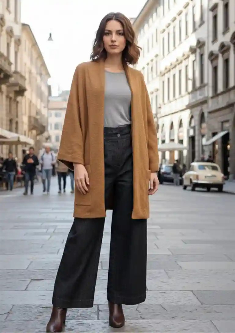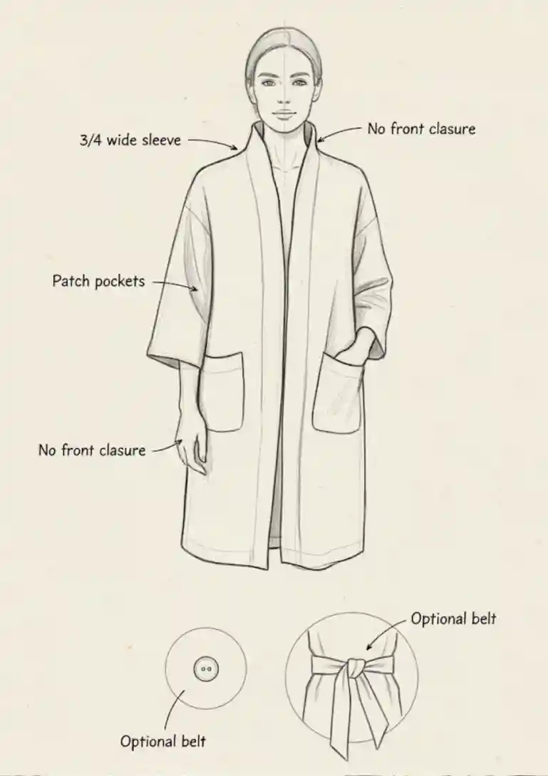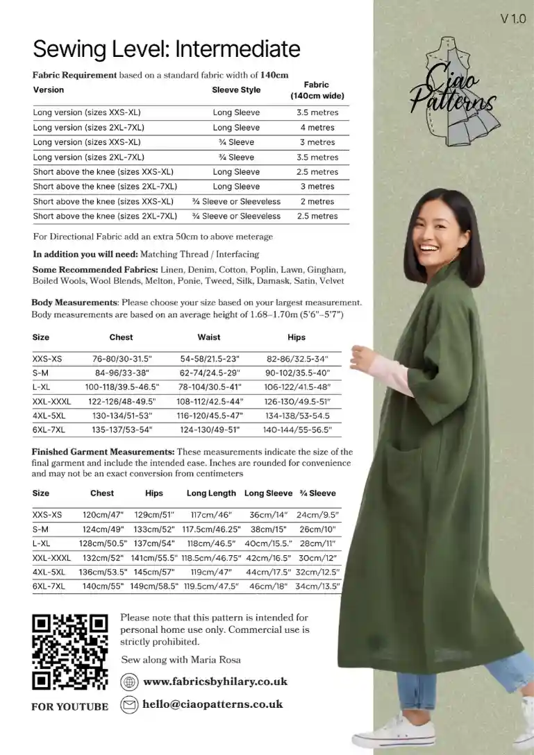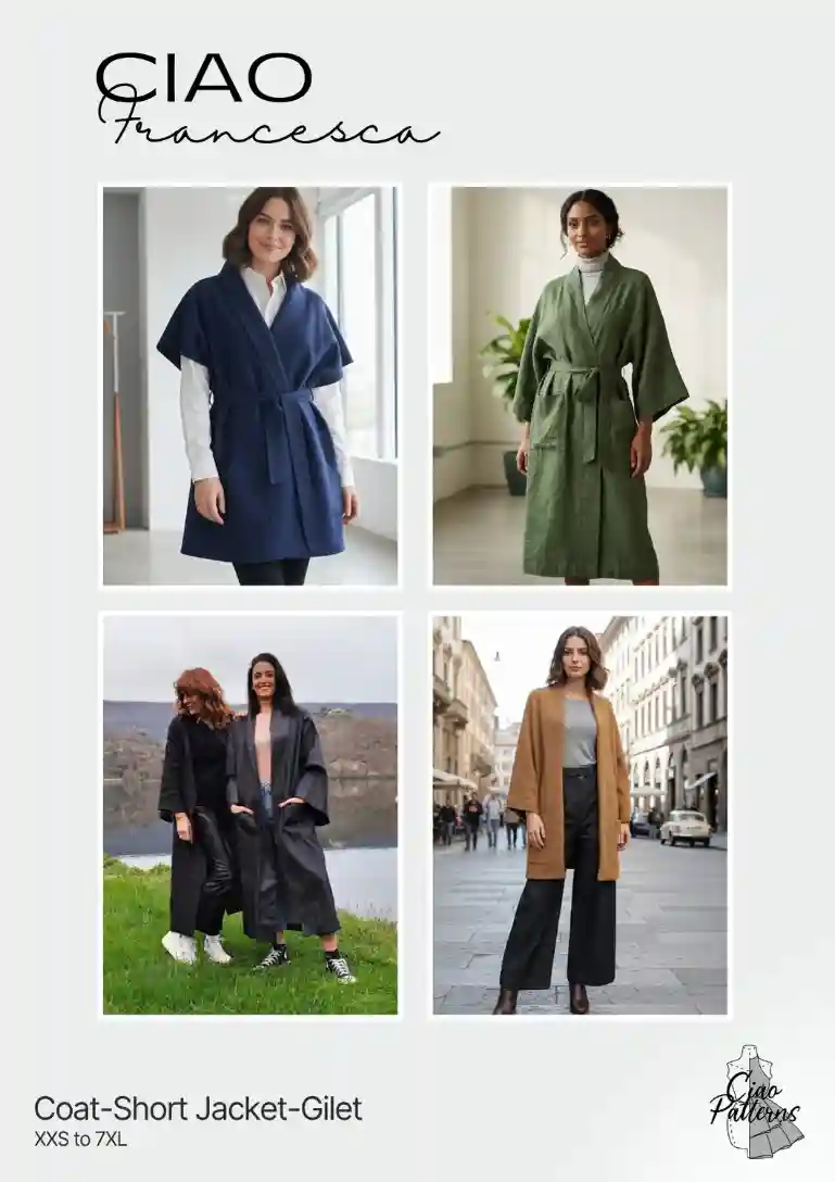 The Ciao Francesca is a fantastic, unlined coat and jacket pattern defined by its inherent versatility and effortless style. Designed to be a foundational piece in any wardrobe, this garment features a modern dropped shoulder and an open-front, collarless design that flatters all genders and ages.