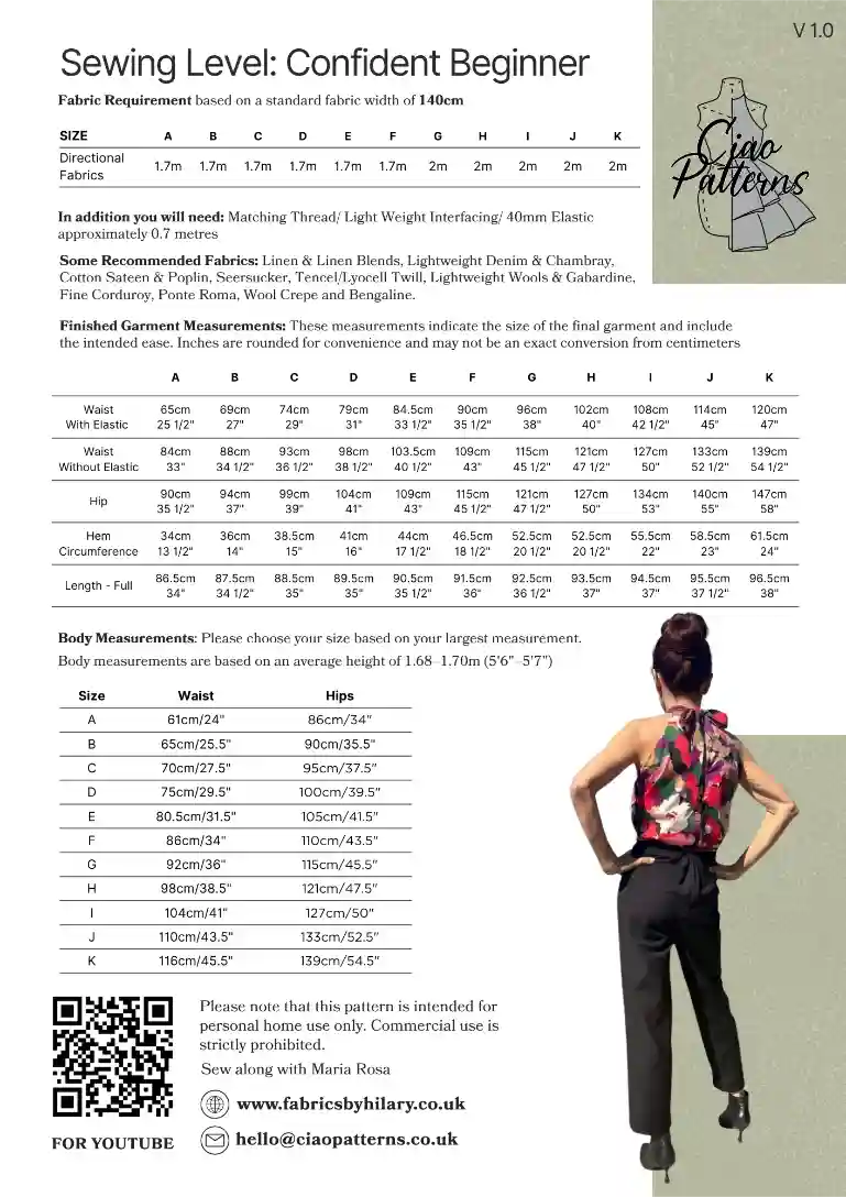 The Ciao Isabella is the perfect project for a confident beginner looking to elevate their handmade wardrobe. Designed with no buttons or zips, these trousers offer a stress-free sewing experience without compromising on style. They feature a flattering flat front waistband paired with an elasticated back for ultimate comfort.